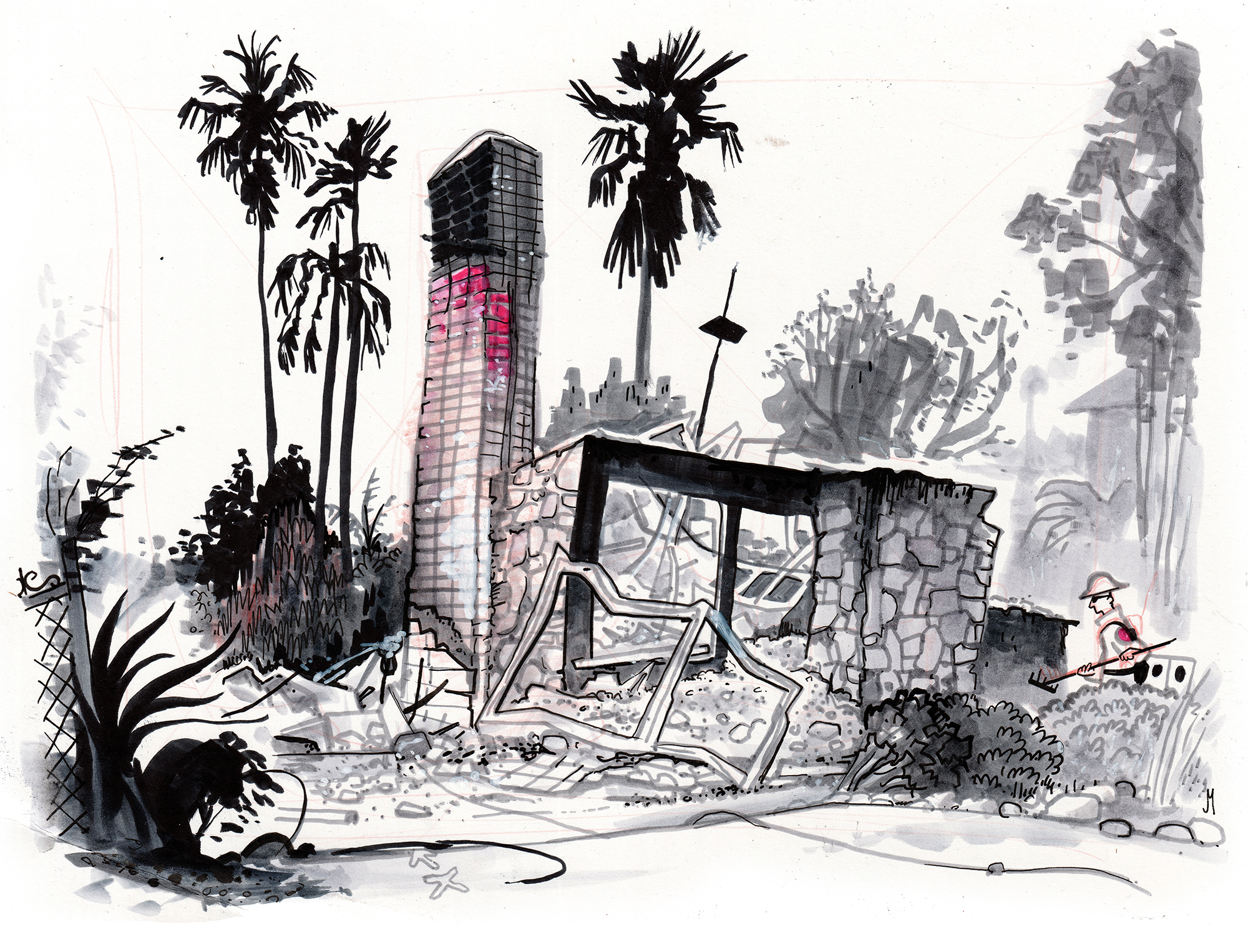 The streets were as quiet as a ghost town. As I rounded a corner, a shocking sight came into view. A chimney and a modern entryway were still standing, but the rest of the house was unrecognizable. It looked like a bomb had gone off.