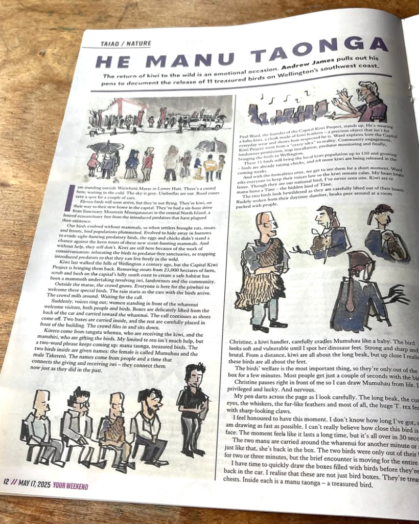 Andrew James, an illustrator and sketchbook artist based in Wellington, recently tagged along with The Capital Kiwi Project, a local conservation agency, to document the release of 11 endangered kiwi birds into the wild. His graphic story was published in The Post’s Your Weekend magazine and online.